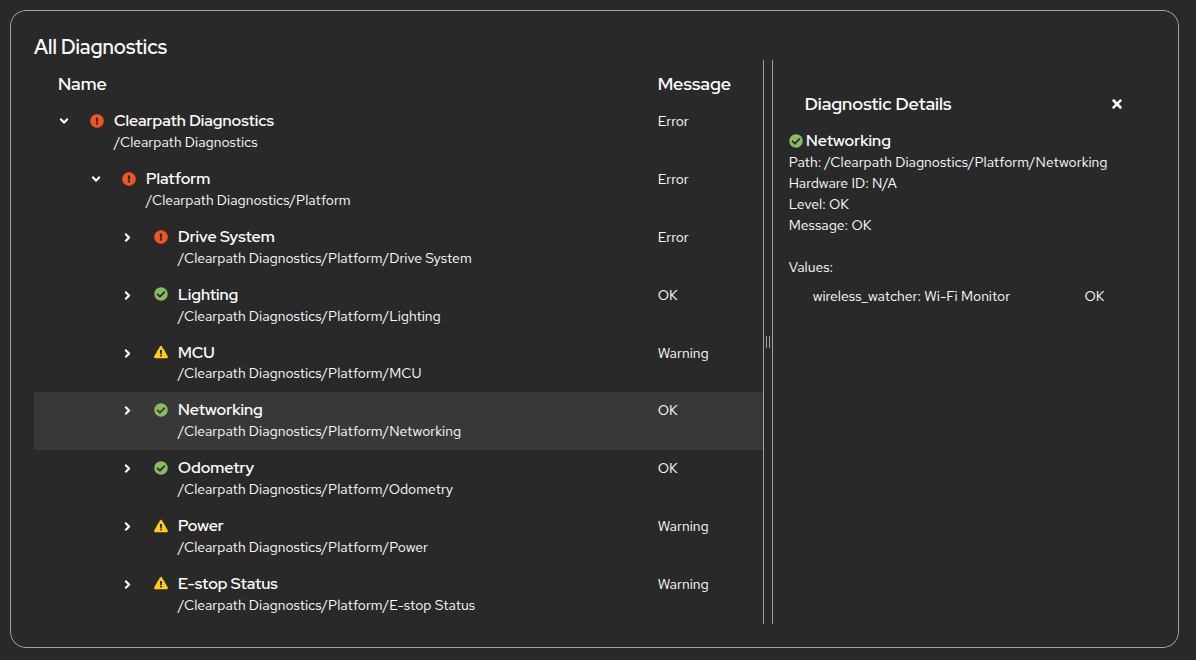 This section displays all ROS 2 diagnostics in an expandable table. If a diagnostic is clicked, the diagnostic details are displayed in a drawer, including associated values.