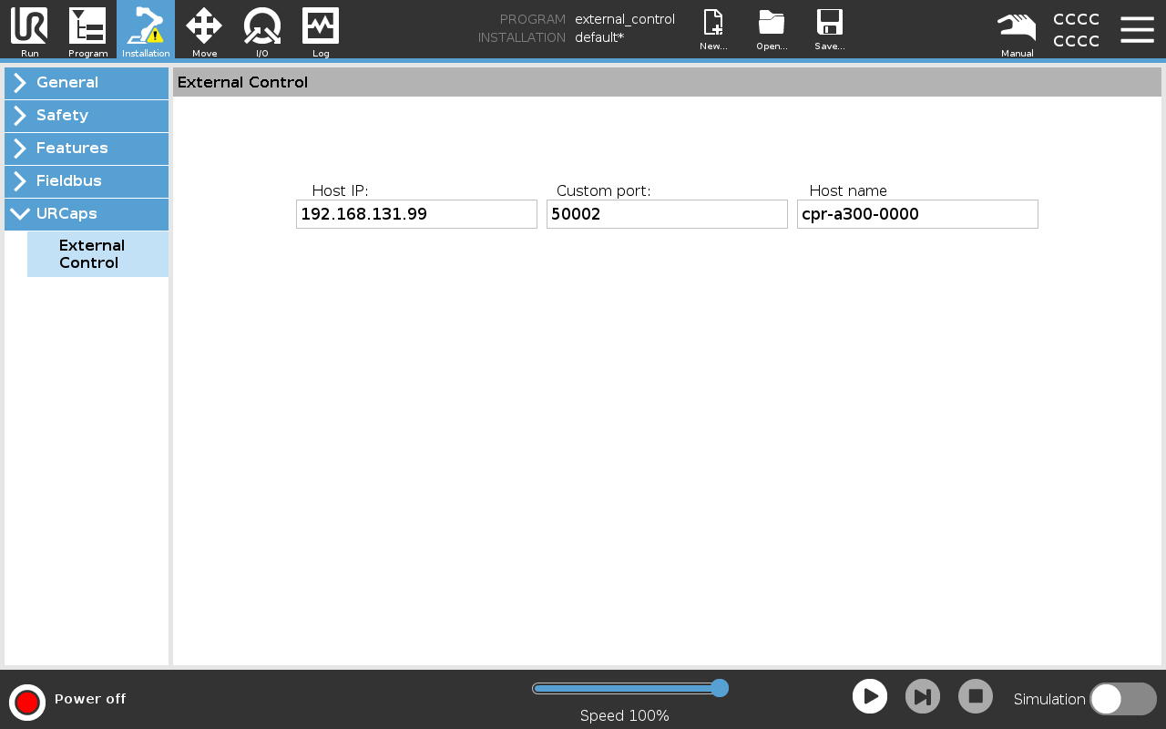 Navigate to the Installation/URCaps page to configure the IP address and hostname of the external device. The standard Clearpath robot computer IP address is 192.168.131.40