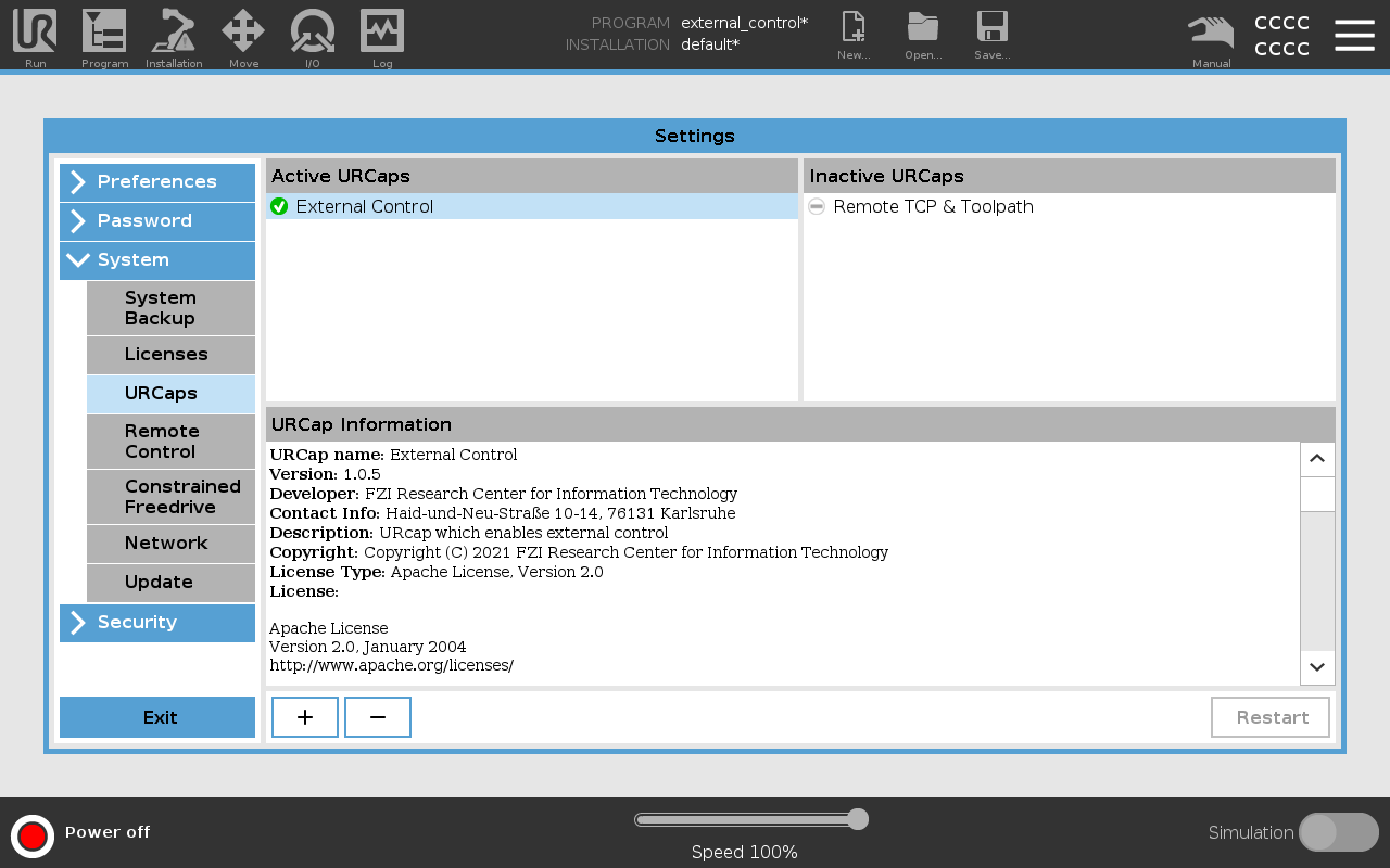Once the robot is in normal mode, you can proceed to initialize the external control program.