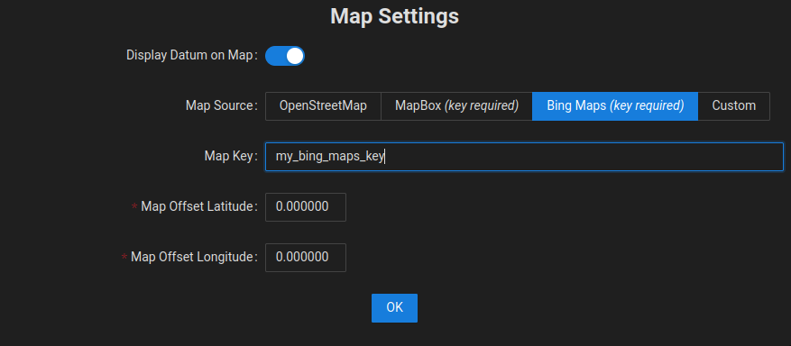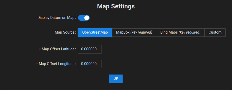 The Web UI is pre-configured to work with MapBox and Bing Maps once a suitable map key has been acquired. Both services offer a free tier that will be sufficient in almost all cases.