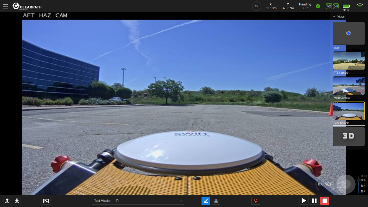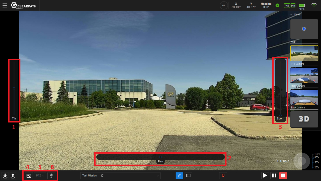 If PTZ and/or Front/Back camera(s) are included on the UGV, their feeds can be viewed through the UI and the PTZ can be controlled through the UI. If not, there will not be any PTZ, Front/Back view(s) in the list of available views.