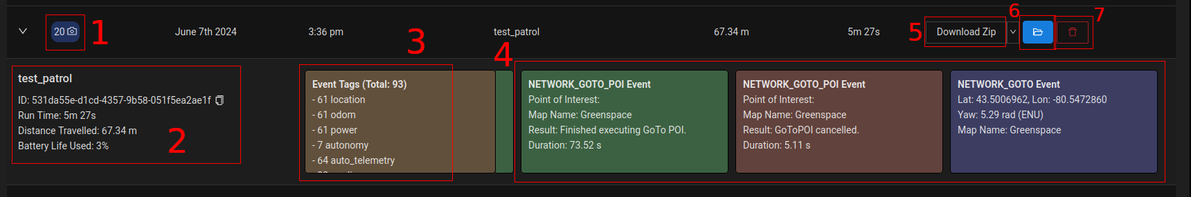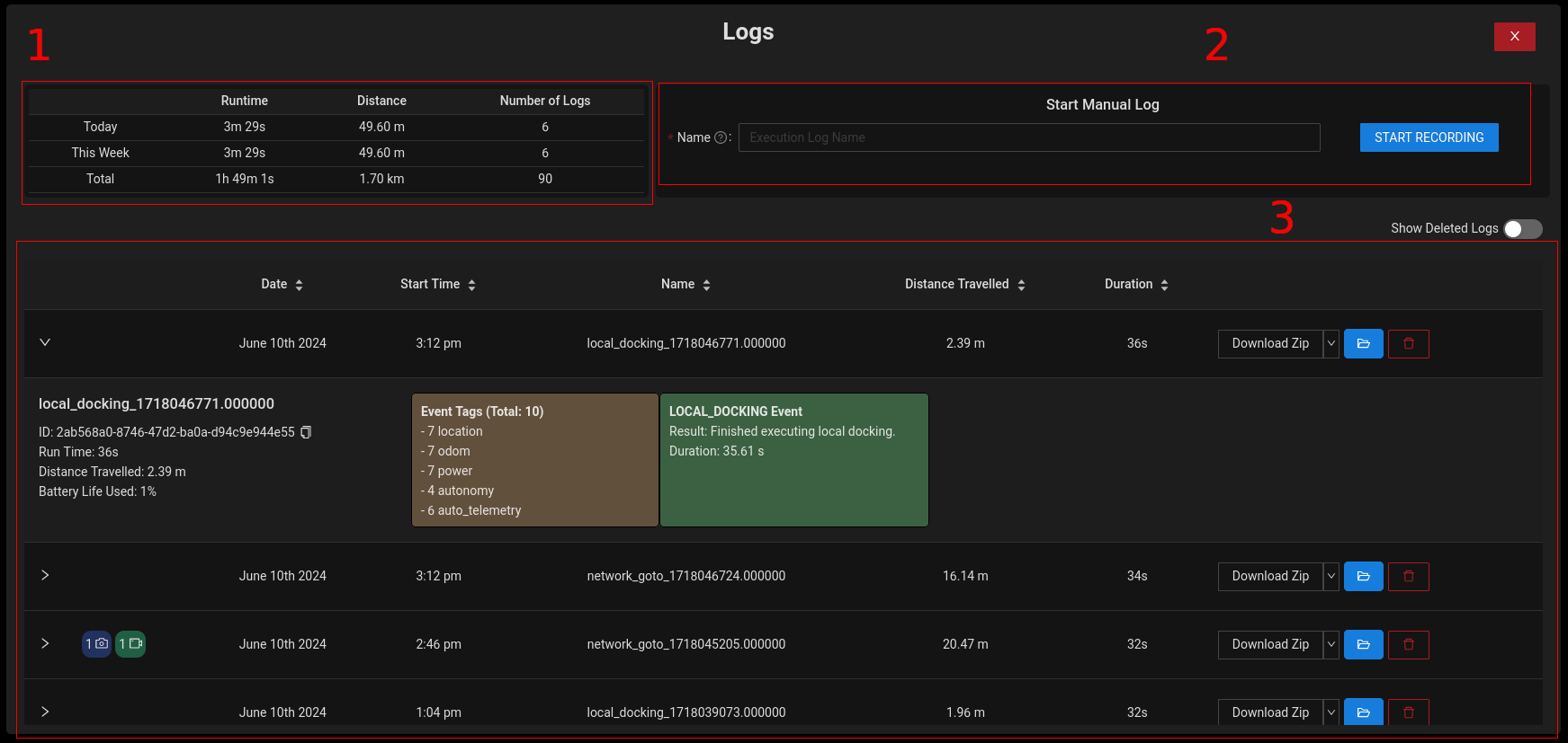 3. Executed Logs: Logs that have executed on the UGV. These can be expanded to show high level information related to events that occurred during the recording.