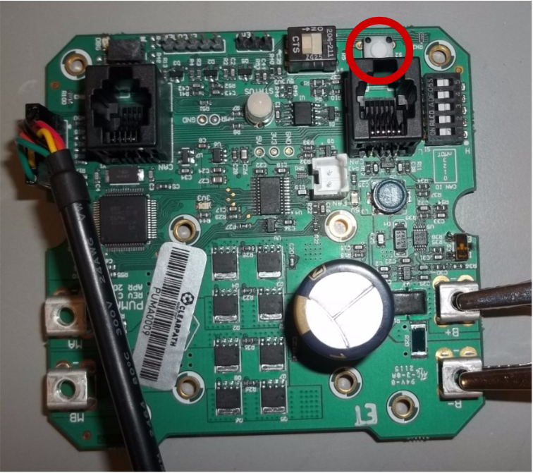 You can do this by pressing the button shown below, and then turning the robot on. You may release the button 3 seconds after turning the robot on. Notice that the large Status LED is not turned on.