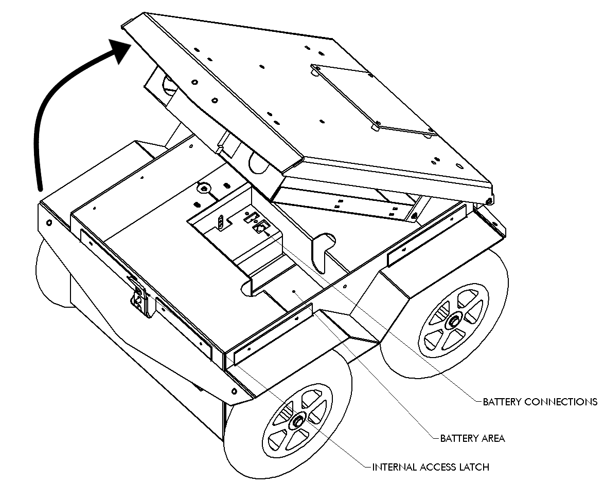 To access Jackal's interior, actuate the latches under the front end of the lid, on the opposite end from the HMI. When you lift the lid, you will see Jackal's onboard lithium battery, and its two connectors. The large Anderson Power Pole connector is to supply power to Jackal and must be connected for Jackal to operate. The smaller white Molex connector allows the battery to be charged inside Jackal while Jackal is powered off. It is recommended to connect both. The interior components of Jackal are labeled below.