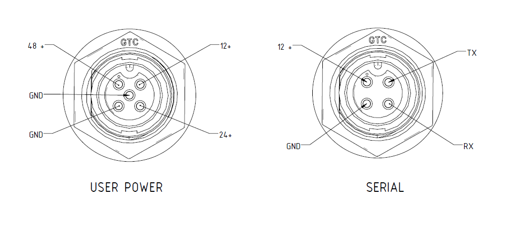 The user power receptacles located in the User Panel are capable of supplying 12 VDC, 24 VDC, and unregulated battery voltage (48 - 60 VDC) for powering Warthog's payloads. See the figures below for connector locations and pinouts. Ensure you select a contact that's appropriate for the gauge of wire used.