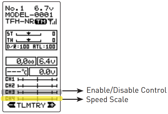 The position of the speed adjustment scale is shown in the figure as CH4. The transmitter needs to be enabled which is done using the Enable Switch. The Enable Switch is a two position spring loaded switch. To enable the RC teleoperation, the switch needs to be held down. If released, the switch returns to the up position to disable the robot. The left joystick is used for the forward and reverse motion of the robot and the right joystick is used for turning.